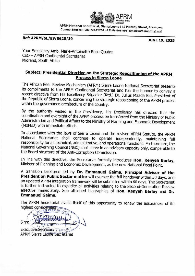His Excellency Brigadier (Retired) Dr. Julius Maada Bio, President of the Republic of Sierra Leone, has issued an Executive Directive transferring the African Peer Review Mechanism (APRM) process from the Ministry of Public Administration and Political Affairs (MPAPA) to the Ministry of Planning and Economic Development (MoPED).